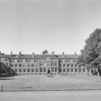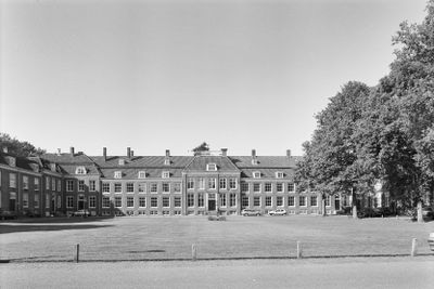 Pand met lange gevel met rechts en links vleugels, gebeeldhouwde middenpartij, mansardedak