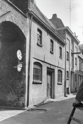 Pakhuis met aan de gasthuissteeg een puntgevel met ezelsruggen en bakstenen tweelichtskozijnen