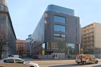 El edificio Wolf Bracka presenta bordes redondeados y una extensa fachada de cristal que sigue la curva de la calle Bracka.