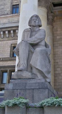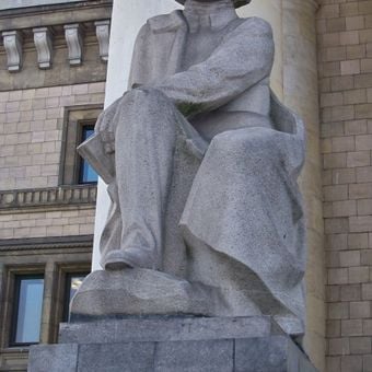 La estatua integra una colección de figuras culturales representadas en esculturas alrededor del complejo del Palacio de Cultura y Ciencia.