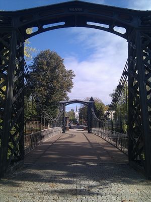 Este puente fue construido entre 1825 y 1827 por la Fundición de Malapane, lo que lo convierte en uno de los puentes colgantes de hierro forjado más antiguos aún en pie en Europa. Su supervivencia a través de casi dos siglos demuestra la durabilidad de su diseño original y métodos de construcción.