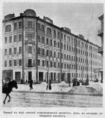La Casa Tselibeev de tres pisos se levanta con una fachada de piedra en la intersección de las calles de San Petersburgo, exhibiendo elementos arquitectónicos del siglo XIX.