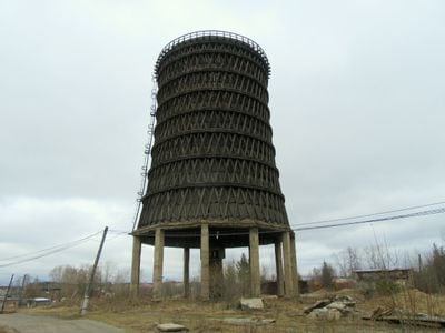 Wooden cooling tower, Torre de refrigeración industrial en Severouralsk, Rusia