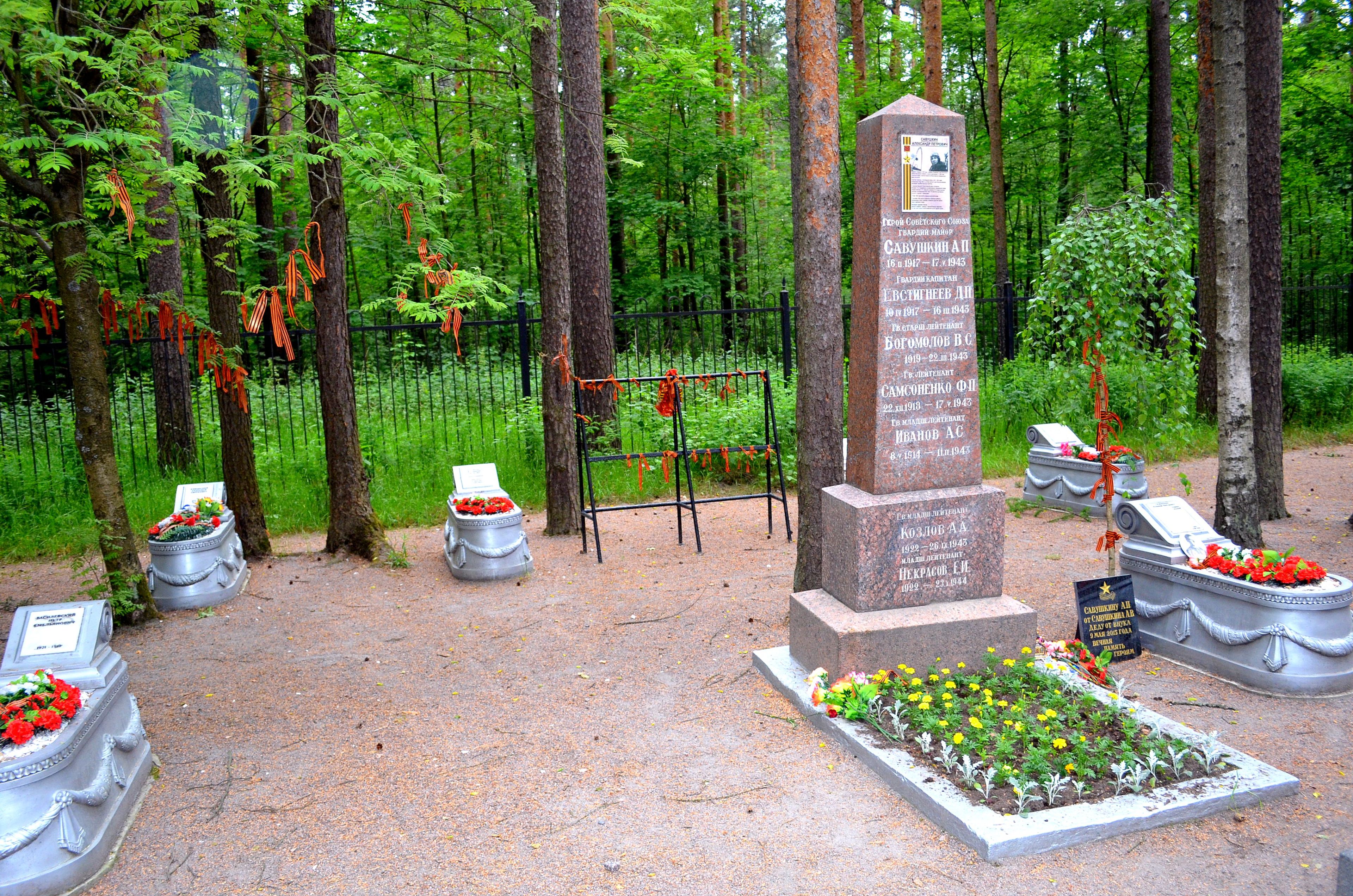 Братская могила, в которой похоронены Герой Советского Союза А.П. Савушкин, гвардии капитан Д.П. Евстигнеев, гвардии старший лейтенант В.С. Богомолов, гвардии лейтенант А.С. Иванов, гвардии лейтенант А.А. Козлов, mass grave, historic site, memorial in Vyborgsky District, Russia
