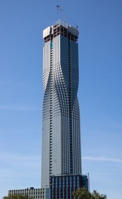 La silueta estrecha de la torre incorpora elementos curvos y balcones individuales, proporcionando vistas panorámicas sobre el distrito portuario de Gotemburgo.