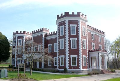El Club de Oficiales de Fort Totten presenta tres torres poligonales, un pabellón central y revestimiento exterior de madera machihembrada.