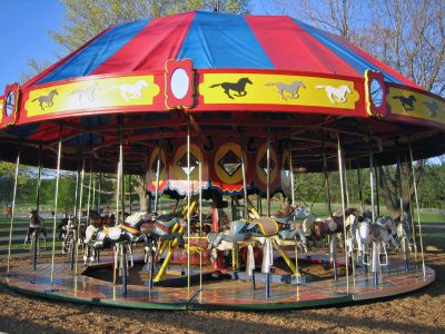 El parque cuenta con un carrusel vintage junto al lago, combinando entretenimiento tradicional con instalaciones recreativas modernas.