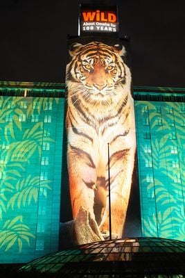 El edificio exhibió fotografías a gran escala en su fachada norte, incluyendo un nadador olímpico en 2008 y un tigre en 2009 por el centenario de la empresa.