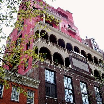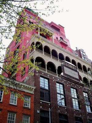El Palazzo Chupi se eleva sobre West 11th Street con sus paredes exteriores rosadas, albergando cinco amplias unidades residenciales en varios pisos.