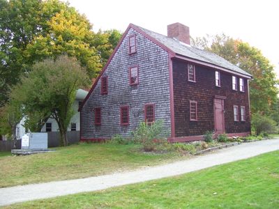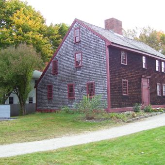 La Taberna Parker muestra un diseño tradicional saltbox con revestimiento de tejas de madera, cuatro bahías frontales y una chimenea central de arquitectura colonial.