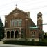 El edificio religioso en 4151 Seminole Street presenta una forma de cruz latina construida con ladrillo tapiz rojo y marrón con pórtico románico.