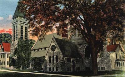 La iglesia de granito presenta una alta torre cuadrada, ventanas de estilo gótico con tracería y trabajo en piedra en 9 Summer Street.