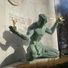 La estatua de bronce de 8 metros representa una figura sentada que sostiene una esfera dorada y un grupo familiar en sus manos.