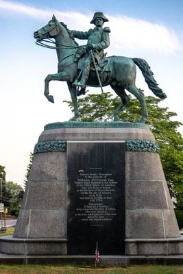 La estatua de bronce representa al General Israel Putnam dirigiendo tropas montado a caballo, con el equino mirando al este y el comandante al norte.