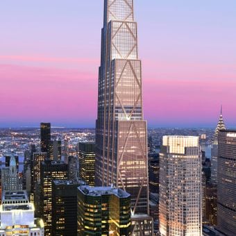 El edificio de 423 metros de altura en 270 Park Avenue presenta 60 pisos con fachadas de vidrio y estructuras de acero expuesto con patrones triangulares.