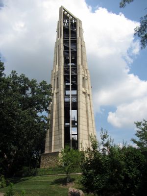 La Torre Moser se eleva 49 metros sobre la Avenida Aurora, albergando 72 campanas que forman uno de los carillones más grandes de América del Norte.