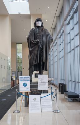 La estatua de bronce de tres metros y medio representa a Benjamin Franklin con una capa que revela su vestimenta colonial dentro de un pabellón acristalado.