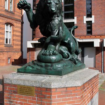 Lion with cubs strikes snake, sculpture by Albert Wolff in Berlin, Germany