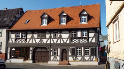 Half-timbered house at Kirchstrasse 32 in Reinheim, residential and commercial building from the end of the 16th century at the junction with Jahnstraße