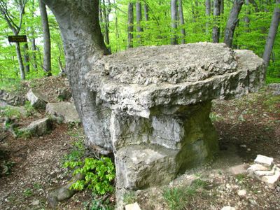 La formación Wolfstisch consiste en una losa de piedra caliza que descansa sobre una base de 1.40 metros de altura cerca de un acantilado.