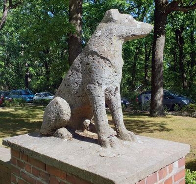Dog figure east of the path Im Eichengrund, part of the sculpture group in Berlin-Siemensstadt, Germany, consisting of two dog figures