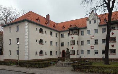 Spring, summer, autumn and winter, four ornaments on the apartment building Harriesstraße 8-10 in Berlin-Siemensstadt, Germany