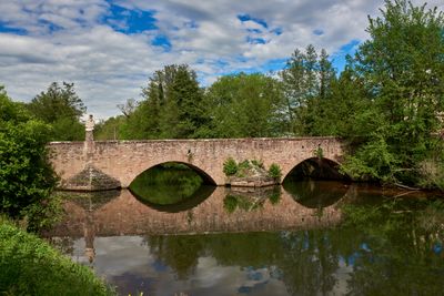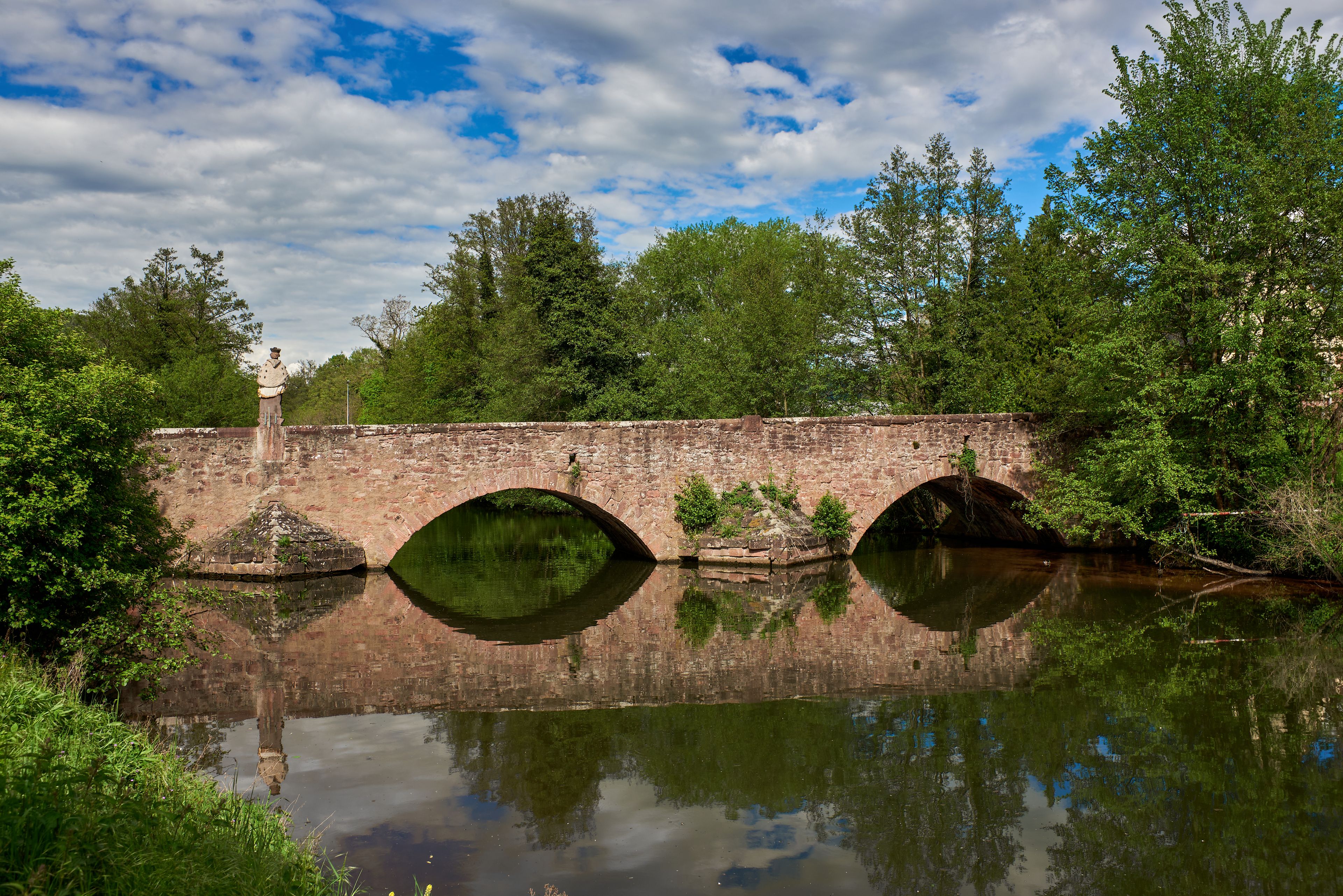 Laurentiusbrücke, Straßenbrücke in Miltenberg (Ufr.), dreibogige Steinbrücke mit massiver Brüstung und Radabweisern, Sandstein, Mitte 14. Jh; St. Nepomuk-Statue, Inschriftsockel mit Figur des Hl. Johann Nepomuk, farbig gefasster Sandstein, barock, bez. 1730
