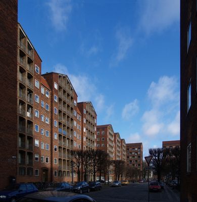 El complejo, diseñado por Kay Fisker, surgió entre 1943 y 1958 como parte de las primeras iniciativas de renovación urbana de Copenhague.