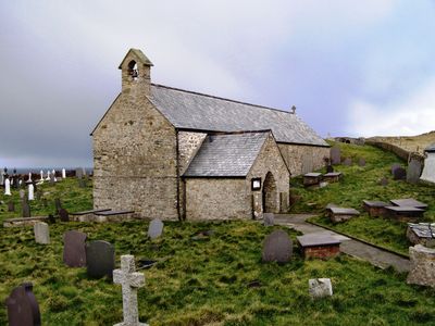 La iglesia de piedra se encuentra sobre acantilados rocosos del norte de Anglesey, con una nave del siglo XII y un presbiterio agregado al siguiente siglo.