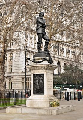 El escultor Hamo Thornycroft creó la estatua en 1888, originalmente ubicada en Trafalgar Square donde permaneció durante muchas décadas. El monumento fue trasladado a Victoria Embankment Gardens en 1953, donde ahora está protegido como una estructura listada de Grado II.