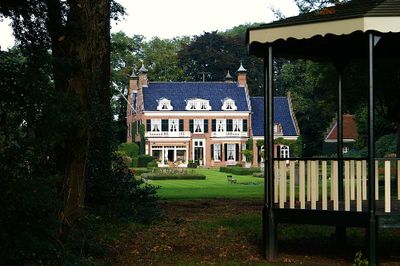 La finca Bijstein abarca 7 hectáreas con una casa principal y cochera rodeadas por caminos de grava, setos recortados y árboles caducifolios.