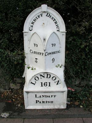 Milepost outside No 322, Grade II listed building in City and County of Cardiff. The mile post is immediatel south-west of the junction with Crossways Road