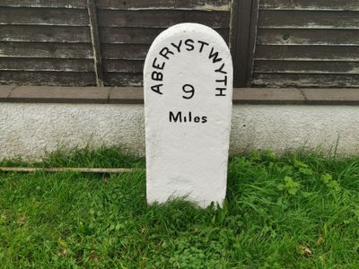 Milestone on A487, Grade II listed building in Ceredigion. Situated on N side of A487, opposite Village Hall