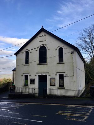 Watford Chapel, grade II listed building in Caerphilly, located on a steep hill below Caerphilly mountain, S of Caerphilly town centre. The gabled entrance fronts the road. To the N is the burial ground