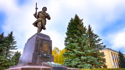 Construido en 1948 por el escultor Yevgeny Vuchetich, el monumento señala el lugar de descanso final de Alexander Matrosov, fallecido en febrero 1943.