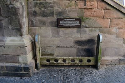 Stocks, By The Town Hall, stocks in Berwick-upon-Tweed, Northumberland, UK