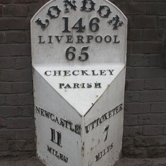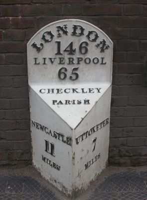 Milepost in front of 1 and 2 Hall Yard Buildings, milepost in Upper Tean, Checkley, Staffordshire, England, UK