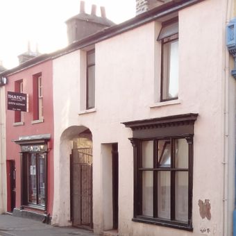 No.18 Eastgate, Grade II listed building in Ceredigion. Continuos row of frontages stepped in the slope; No 8 near the junction with Baker Street and No 18 offset to right of segmental arch leading to Gateway Buildings