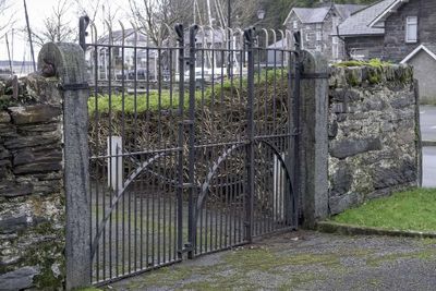 Harbour yard walls and gates to Greaves Wharf and Oakleys Wharf, Grade II listed building in Gwynedd. Between The Oakleys and Wharf House, facing a lane behind Heol y Parc