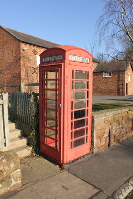 K6 telephone kiosk, between frontages of Institute and Old Rectory, Grade II listed building in Aldford and Saighton, Cheshire, UK