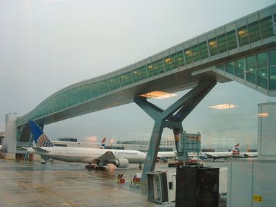 Gatwick North Terminal Pier 6 Bridge, UK skyway linking the north terminal at Gatwick Airport with a satellite pier over an active taxiway