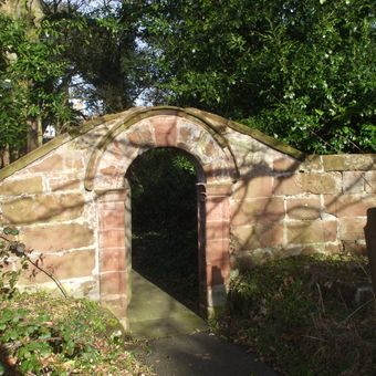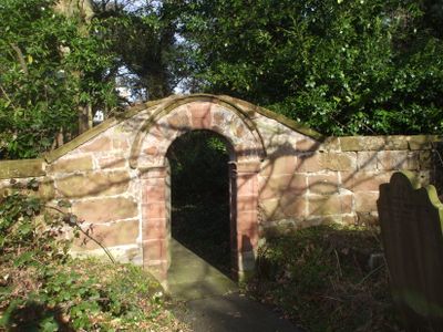 Churchyard walls and gateway to church of St Oswald, structures in Backford, Cheshire, UK