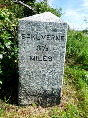 Milestone, Kernewas, gateway on straight road, milestone in St Keverne, Kerrier, UK