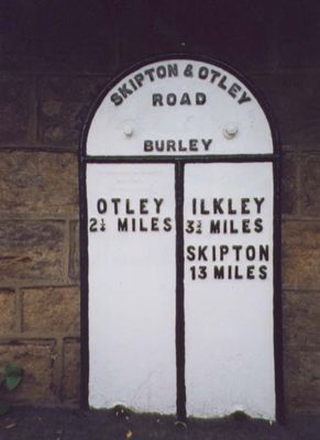 Milestone, Main Street, Burley in Wharfedale, opp. Norwood Avenue, milestone in Otley, Leeds, UK