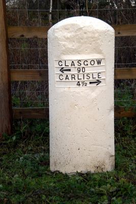 Milestone, newly constructed road for non-motorway traffic, back of Shell petrol station; M74 carriageway, milestone in Rockcliffe, Carlisle, UK