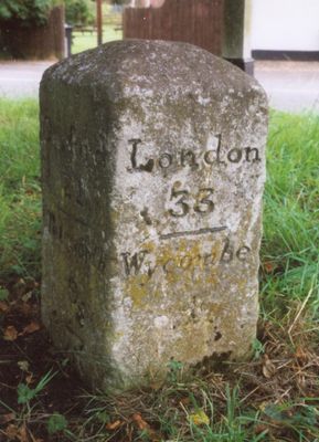 Milestone, Wycombe Road; in front of Dashwood Arms PH at Chipps Hill jct, where older road forms lay-by