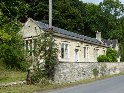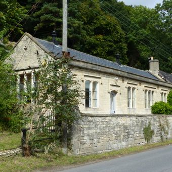 School and school house with boundary walls, Grade II listed former school building in Slad, Painswick, Stroud, Gloucestershire, UK