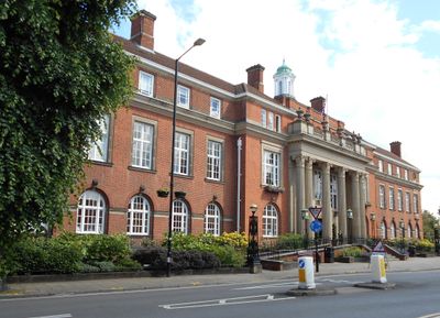 La estructura neoclásica de tres pisos en Coton Road incluye trabajos en piedra detallados, una cámara del consejo, salas de comités y oficinas administrativas.