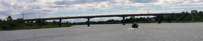 El puente Rusnės se extiende 332 metros sobre el río Atmatos, con ocho tramos y una altura de 15 metros sobre el nivel del agua.