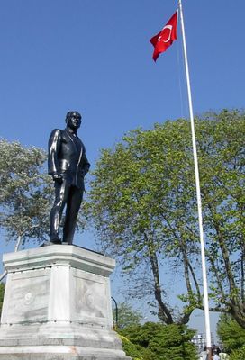 La estatua de bronce de Mustafa Kemal Atatürk mide 4.75 metros sobre una base de mármol, alcanzando una altura total de 8.85 metros en Estambul.